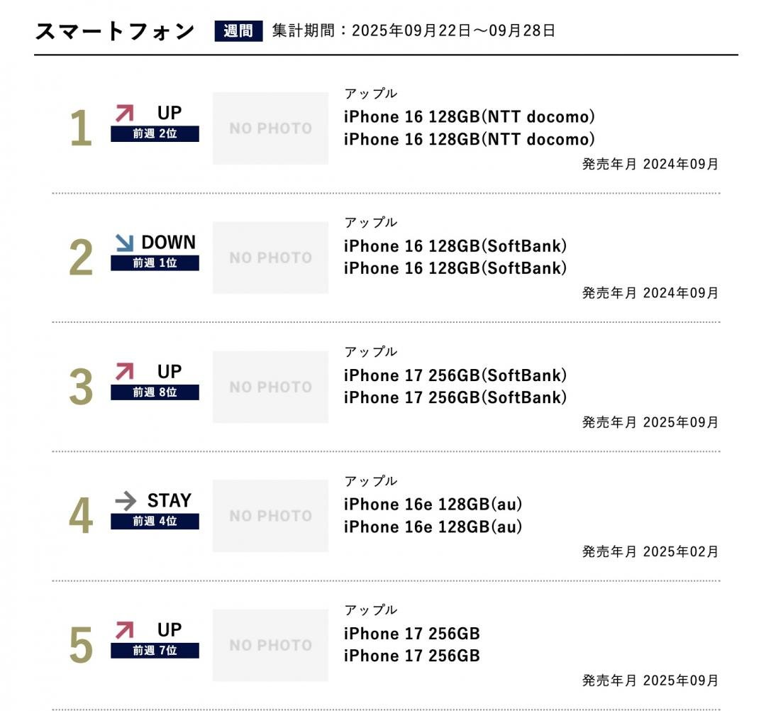 根據日本BCN網站的9月22日至28日統計數據 (彙整實體和線上通路),顯示在iPhone 17上市第一週,日本手機銷售冠軍竟然是iPhone 16 128GB。外界推估是新機推出後,蘋果官方同步調降iPhone 16 128GB價格,因此成為熱門首選。