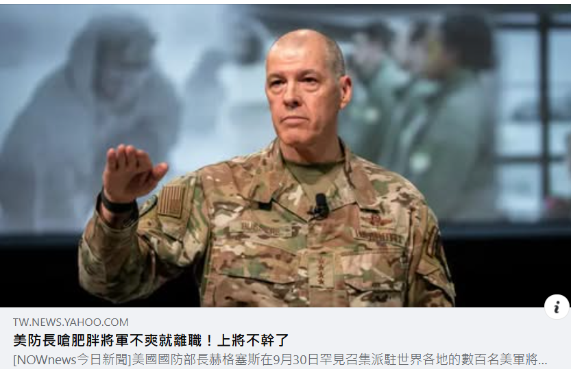 根據路透與美聯社報導,赫格塞斯在美軍將領集會上抨擊美國的肥胖將軍讓人看不下去,「老實說,在五角大廈的大廳裡看到肥胖的將軍和海軍上將,完全令人無法接受」,他還強調,未來所有的軍官體能測驗,將統一以男性標準評核,強調這不是讓女性禁止服役,「我不希望我的孩子加入的軍隊中,有人體能不合格、有無法達到體能標準的女性以及不熟悉操作武器的人」