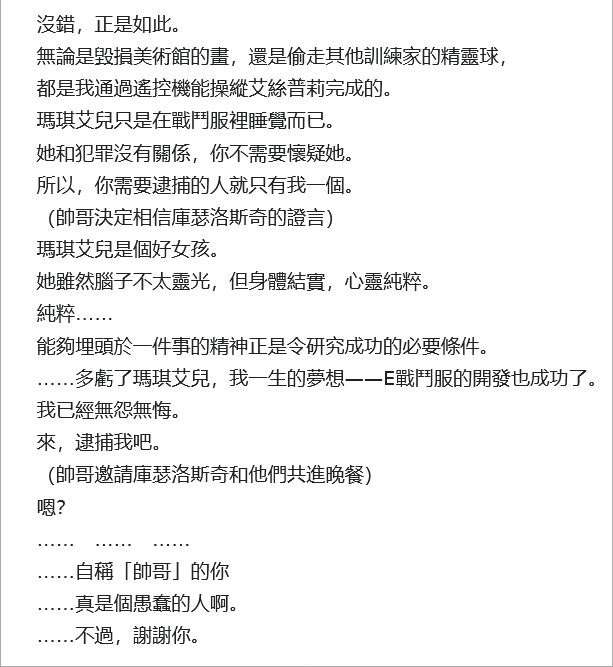 最後在主人翁跟帥哥的努力下,庫瑟洛斯奇被捕,進牢前把自己的寶可夢跟戰鬥服都送給了她