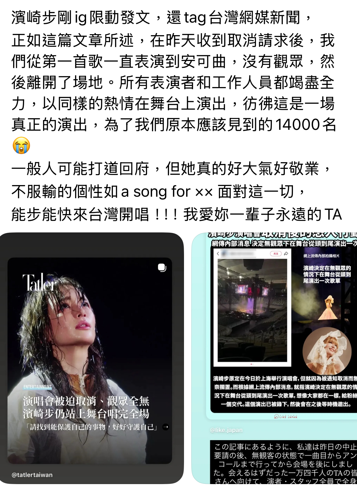 中國主辦方於28日下午宣布取消原訂今(29日)在上海浦發銀行東方體育中心的演唱會,承諾30日內全額退票,中日200名工作人員則在接獲通知後立刻啟動拆台。濱崎步隨後以長文向1.4萬名買票觀眾致歉,坦言團隊是「接到要求取消的通知」,語氣充滿無奈,同時強調對所有工作人員與歌迷深感抱歉,未說明取消理由,但字裡行間皆可見震驚與心碎。中國主辦方於28日下午宣布取消原訂今(29日)在上海浦發銀行東方體育中心的演唱會,承諾30日內全額退票,中日200名工作人員則在接獲通知後立刻啟動拆台。濱崎步隨後以長文向1.4萬名買票觀眾致歉,坦言團隊是「接到要求取消的通知」,語氣充滿無奈,同時強調對所有工作人員與歌迷深感抱歉,未說明取消理由,但字裡行間皆可見震驚與心碎。