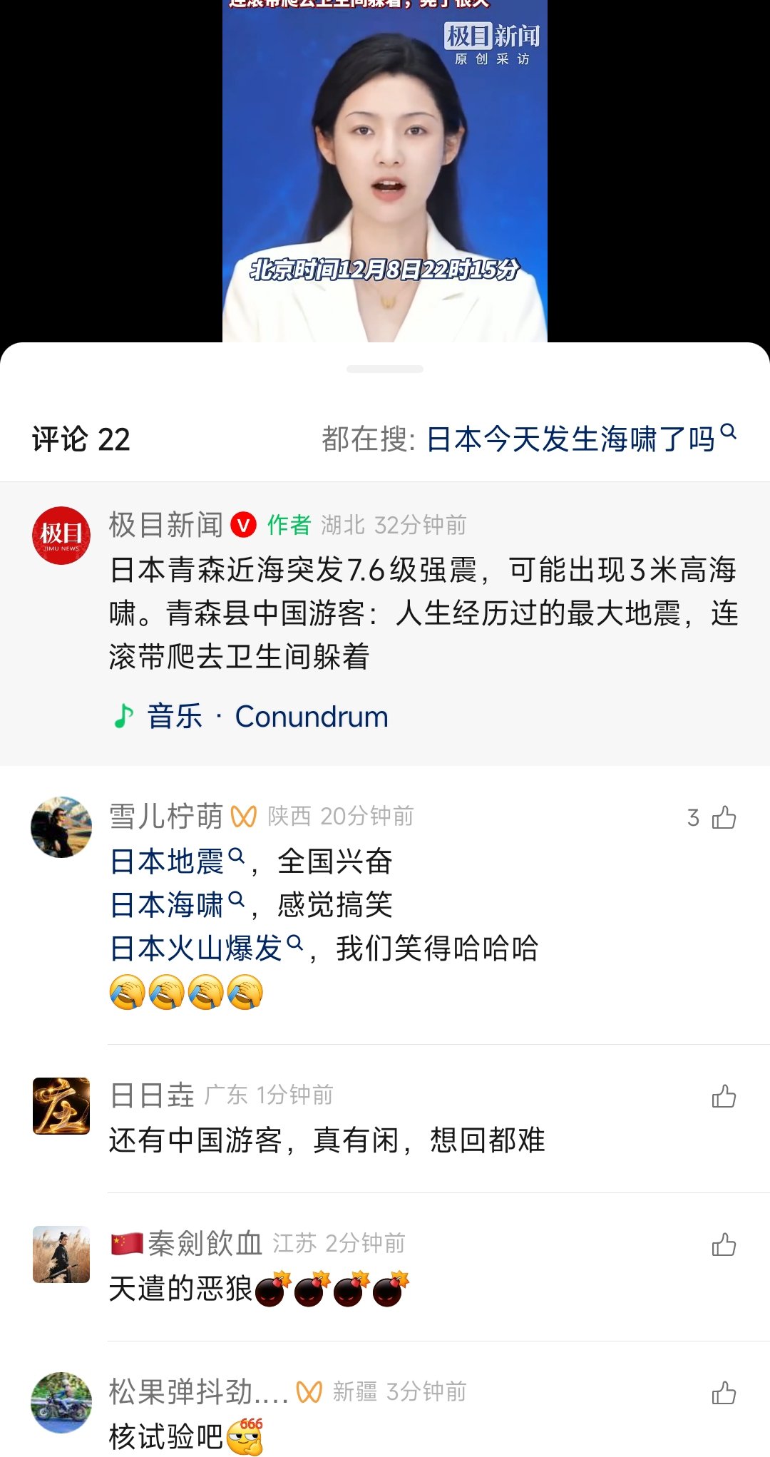 12月8日 日本發生7.5級強震後