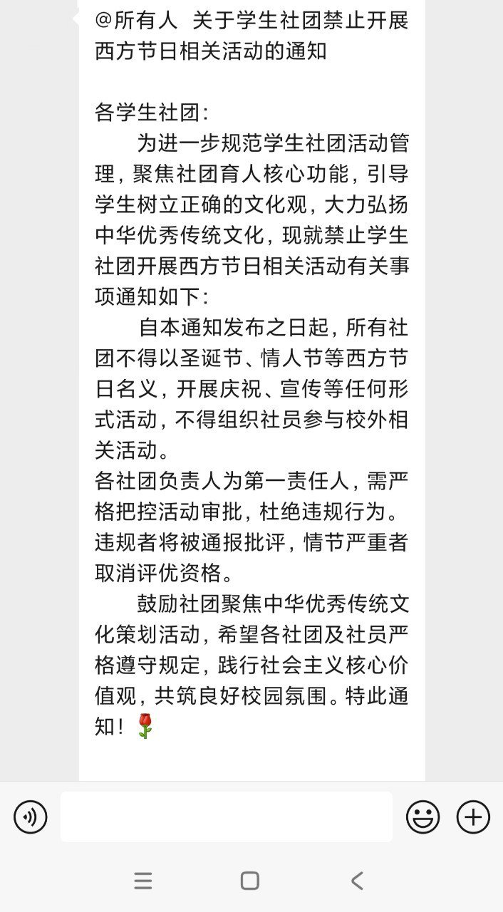 發布通知,明令禁止校內學生社團組織任何與西方節慶相關的活動,同時嚴禁學生參與校外同類慶祝活動。一旦發現,將按校規嚴肅處理。