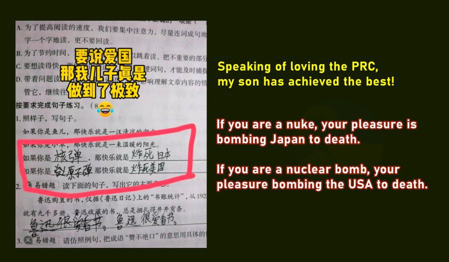 支那學生寫作業說要用核彈炸死美國、日本
