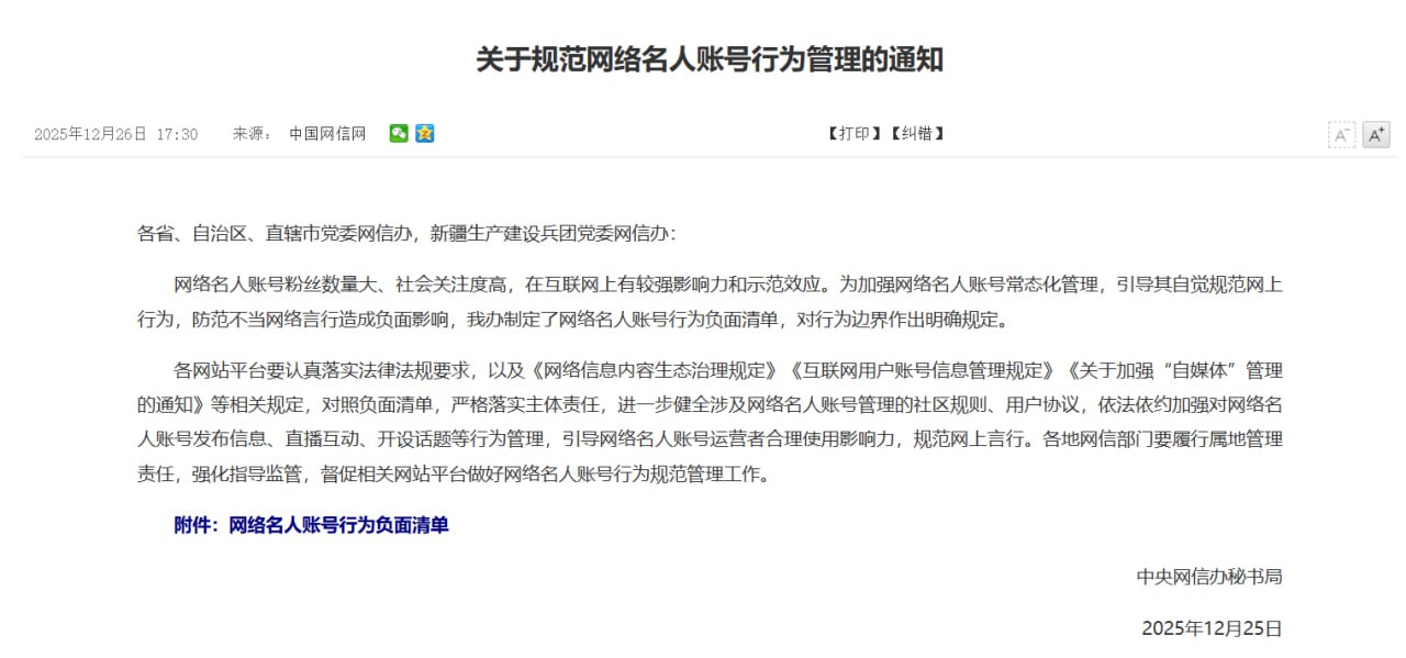 12月26日 中央網信辦發布《網路名人帳號行為負面清單》。