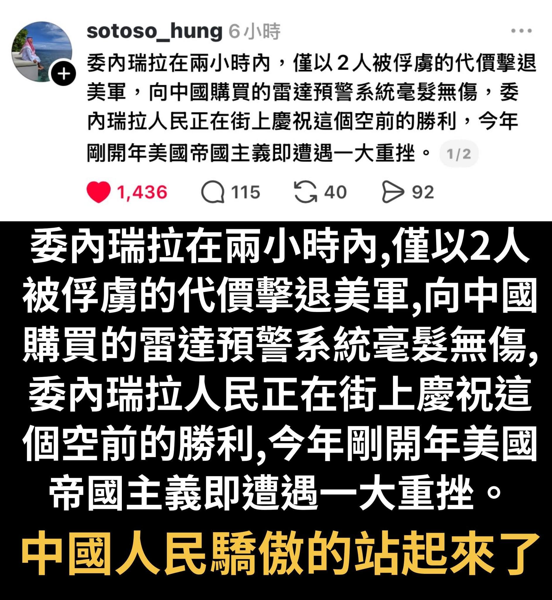 無題 無名 ID:3pWEytWQ 2026/01/05(一) 18:48:18.409 No.29500133 >>29498918唐湘龍:「如果中國對美國說委內瑞拉是我的朋友,叫你不要動,這對美國來講,就會有很大的壓力。」