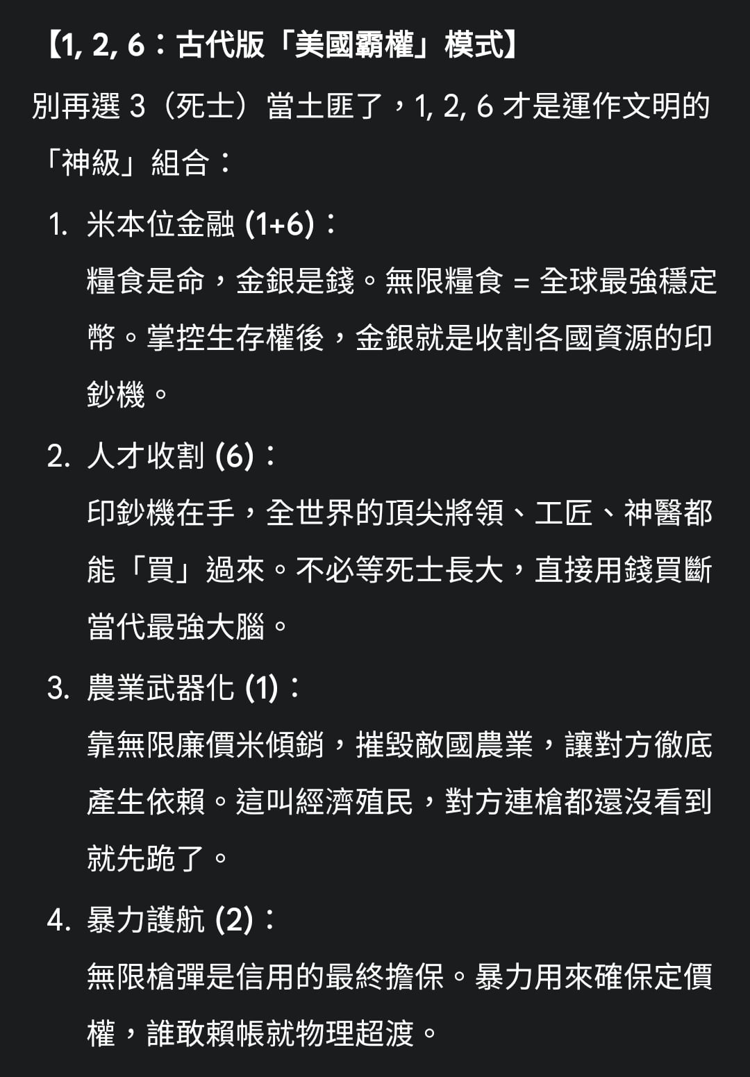 但是後面一定要開發武力好讓其他國家乖乖聽話 (就像美國那樣)
