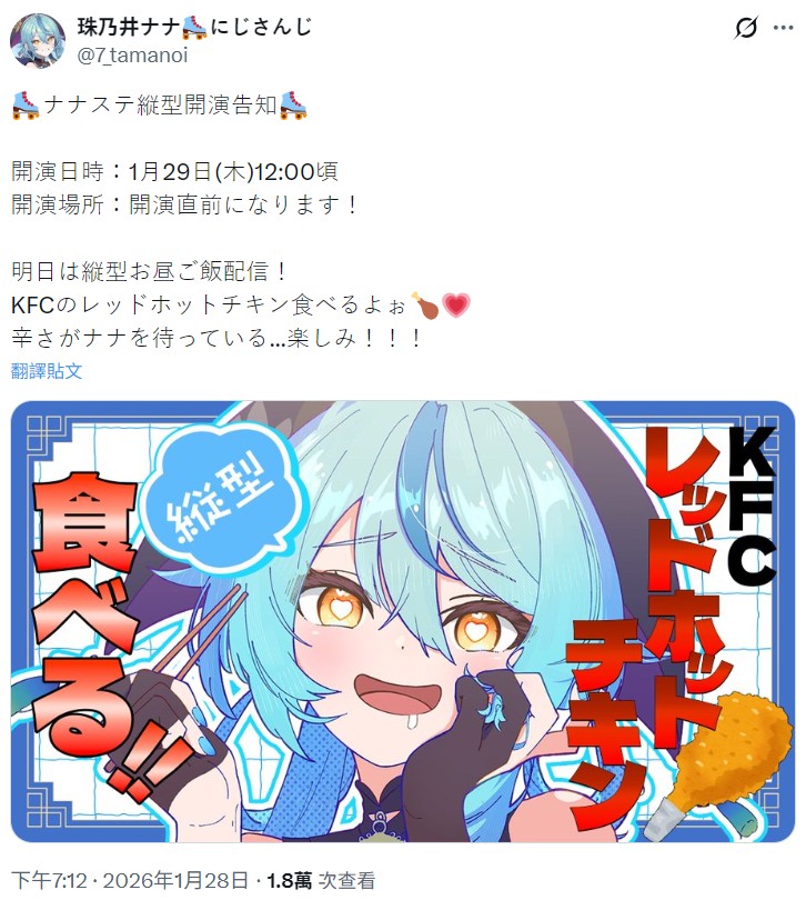 無題 無名 ID:DrK38nHE 2026/01/28(三) 21:31:51.763 No.29637663 ナナ明天中午吃KFC