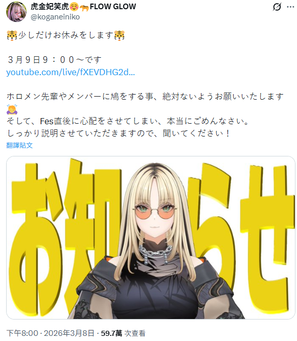 無題 無名 ID:IC8e5E9o 2026/03/09(一) 10:05:31.613 No.29849123 https://x.com/hololivetv/status/2030801880688074896?s=20