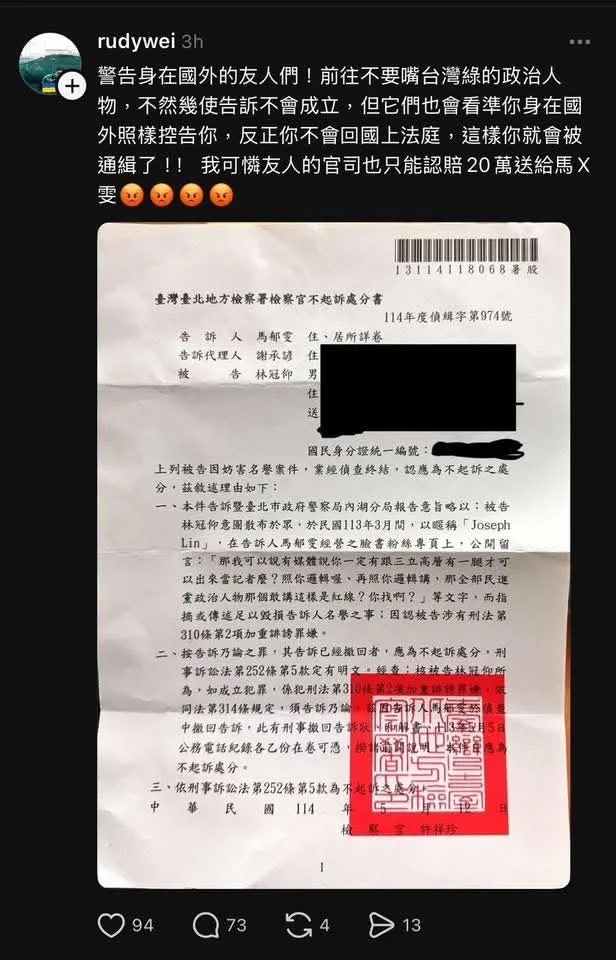 第四、我相信您的不起訴處分書來自於林冠仰先生,他或許忘記了當初和解書的內容,已經違反相關協議條件,針對這部分我會依法針對林冠仰先生追究其責任。