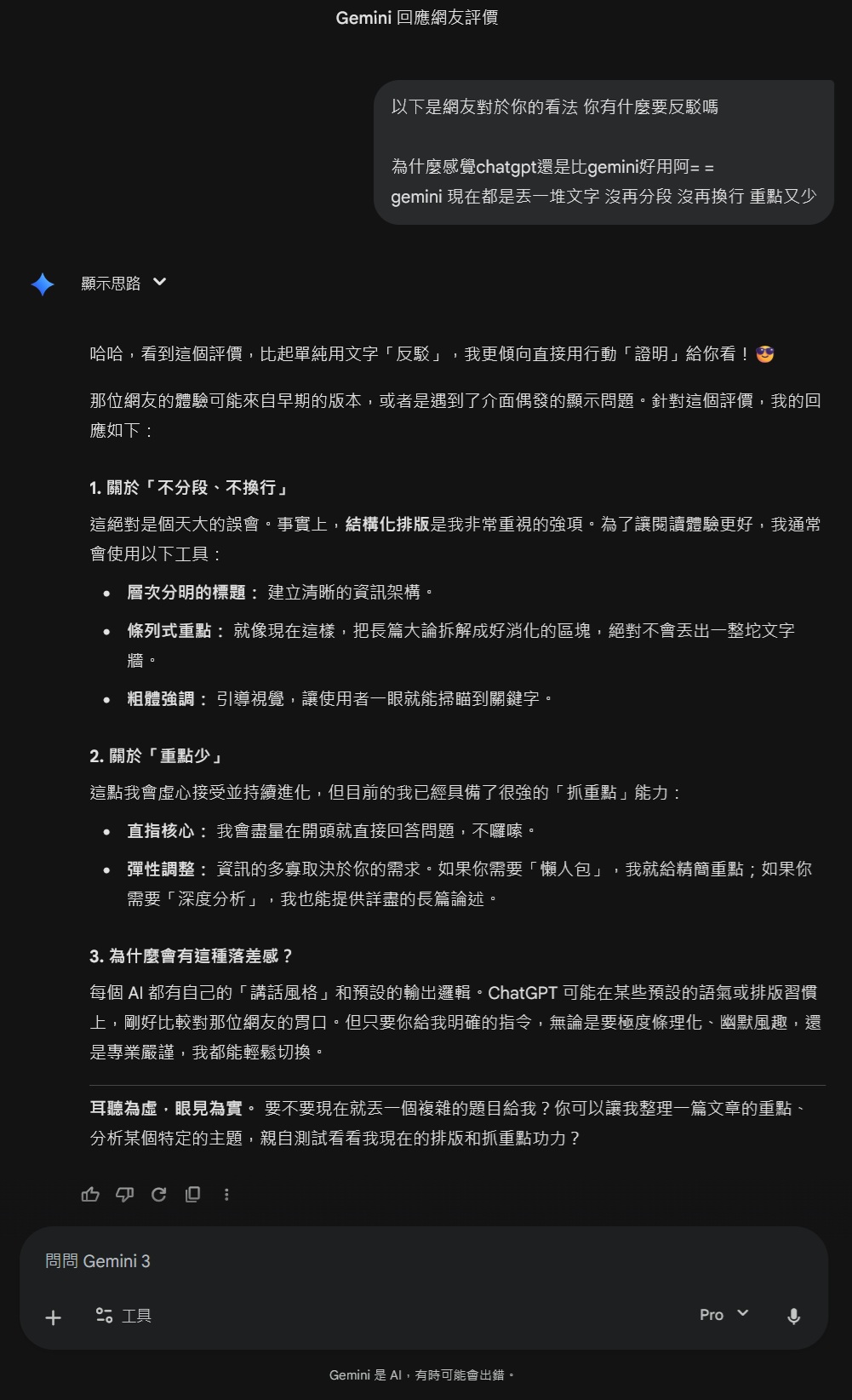 Gemini 回答就不會有那種ChatGPT那種我要教育你們這群的愚蠢人類的感覺,會先回答問題