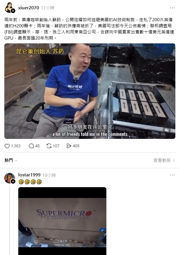 [綜合]美超微高層被控走私25億輝達AI晶片到中國! 並被拍到用吹風機移除標籤 無名 ID:eQOcCM2M 2026/03/21(六) 09:15:12.919 No.29918020 評分:0, 年:0, 月:0, 週:0, 日:0, [+1 / -1] 最後更新:2026-04-05 11:17:54