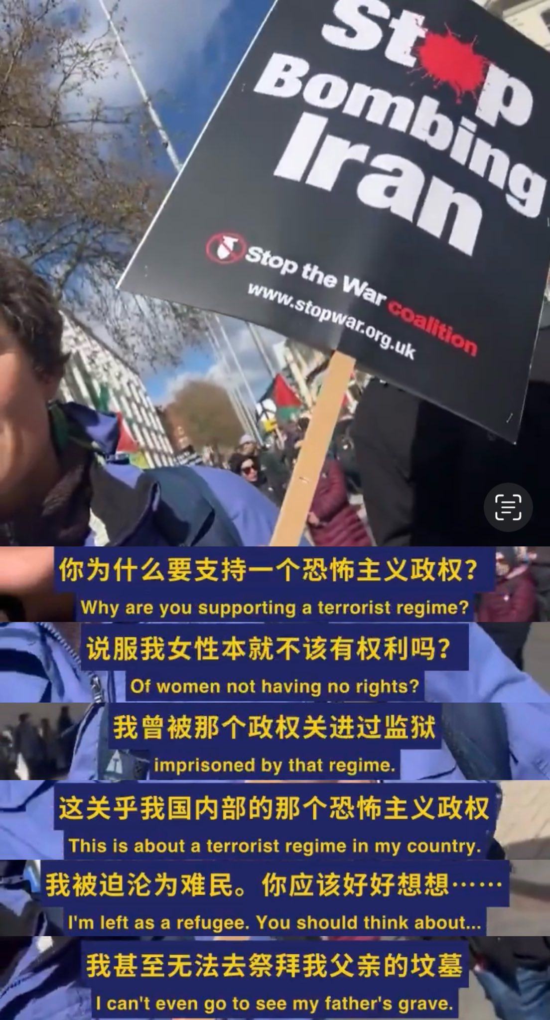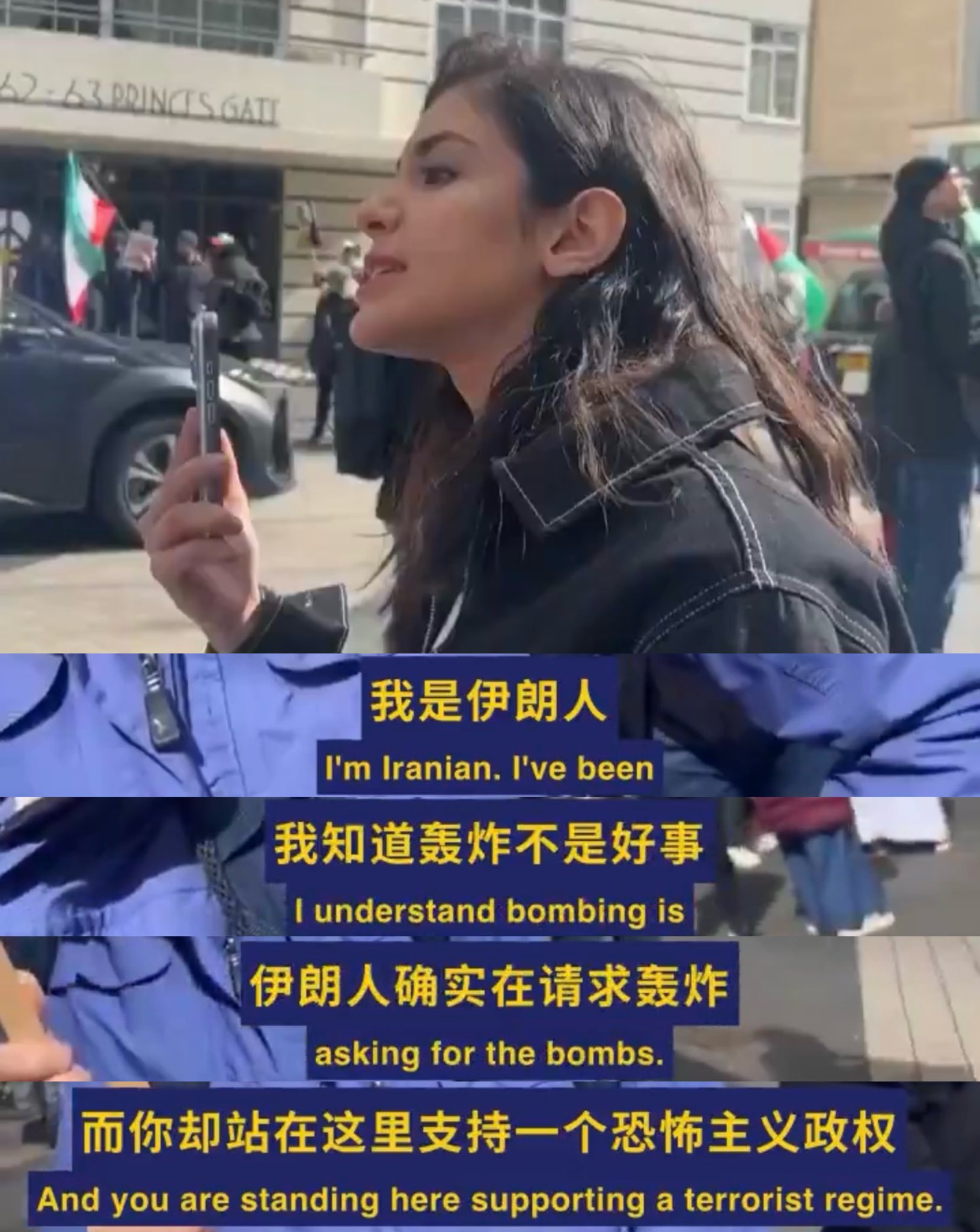 看到一段影片:英國街頭,白人女性舉牌呼籲停止轟炸伊朗政權。
