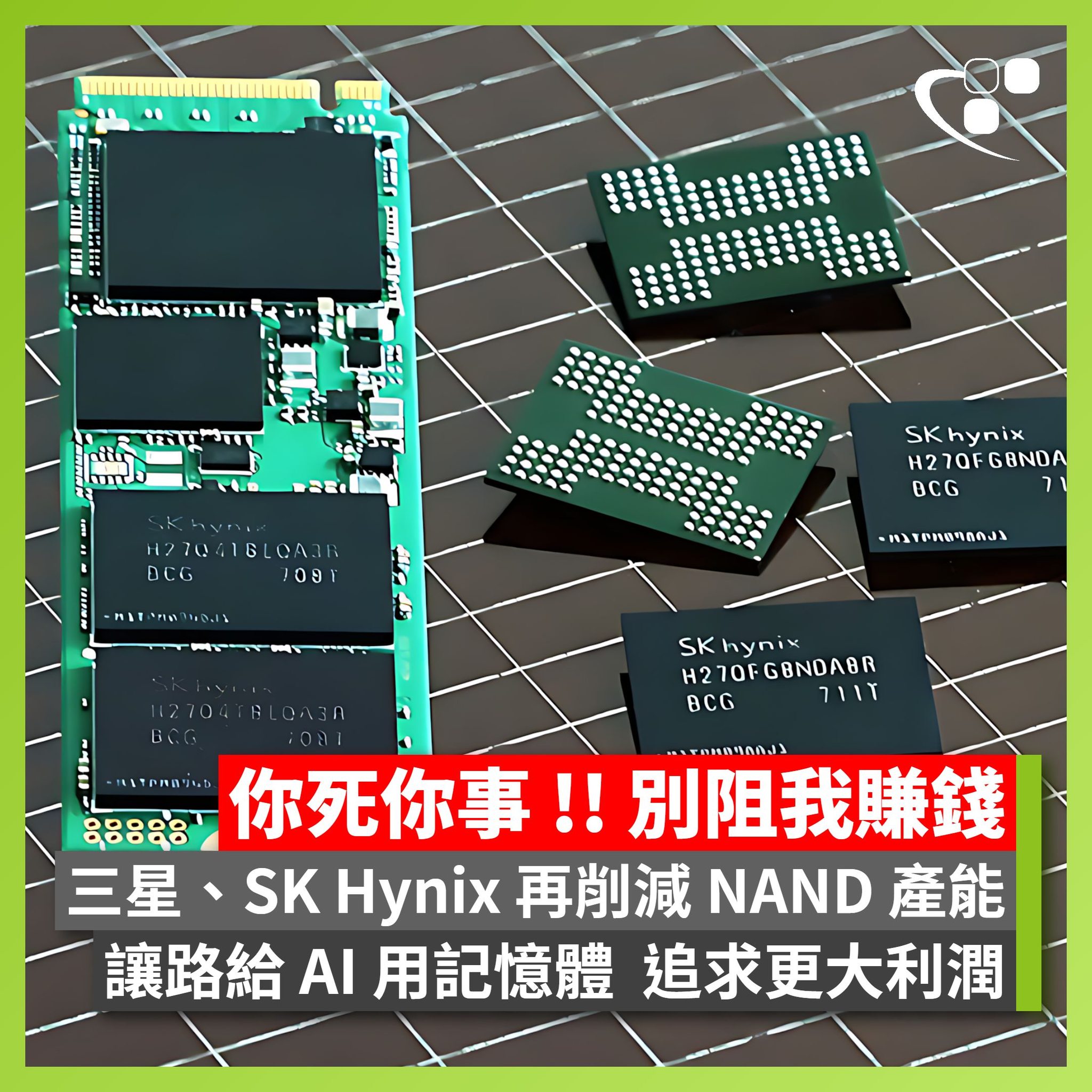 【錢錢錢錢 ... 😂】韓國媒體報導,SAMSUNG 與 SK Hynix 宣布削減 NAND Flash 晶片產能,把產線調整至生產 AI 用的 HBM 記憶體晶片,預期此舉將進一步加劇 SSD 價格上漲。如果你真係仲未買 SSD,唔好再做等等黨,要買就快買。